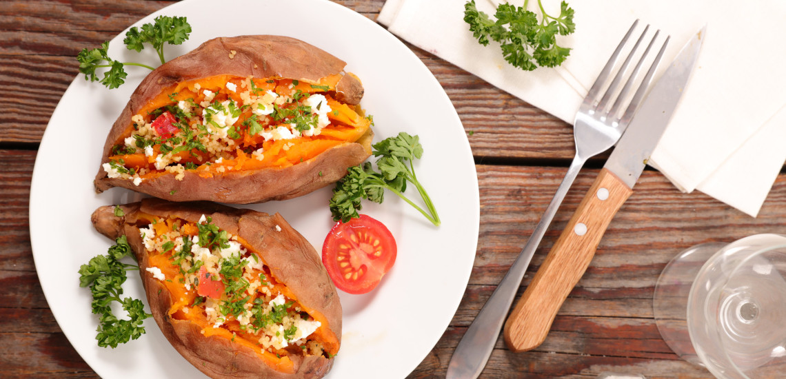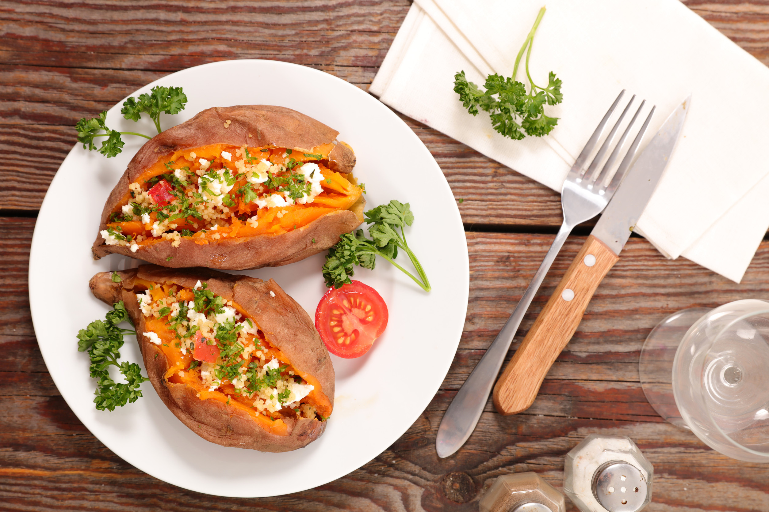 Batata umyj i ponakłuwaj widelcem. Włóż w całości do piekarnika na blaszce wyłożonej papierem do pieczenia i piecz przez ok. 40 minut w 200C. W tym czasie przygotuj farsz. Rozkrusz ser i wymieszaj go z pokrojonym w kostkę pomidorem oraz przyprawami. Po upieczeniu wyjmij batata z piekarnika, przekrój wzdłuż, wydrąż część miąższu z środka i dodaj go do farszu. Gotowy farsz przełóż do batata. Wstaw z powrotem do piekarnika i zapiekaj ok. 10 minut. Podawaj z jogurtem naturalnym i natką pietruszki.
