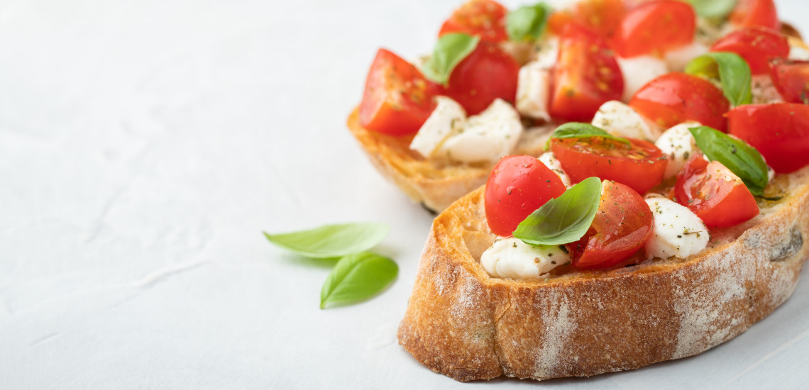 Pomidora pokrój w kostkę i przełóż do miski, dodaj przeciśnięty czosnek, drobno pokrojoną cebulę, oliwę oraz przyprawy. Na chleb wyłóż pokrojoną w plastry i dokładnie osuszoną mozarellę. Wyłóż na papier do pieczenia i wstaw do nagrzanego piekarnika, piecz 10 minut w 180C. Po tym czasie wyjmij z piekarnika, nałóż na grzanki przygotowane pomidory i udekoruj rukolą.