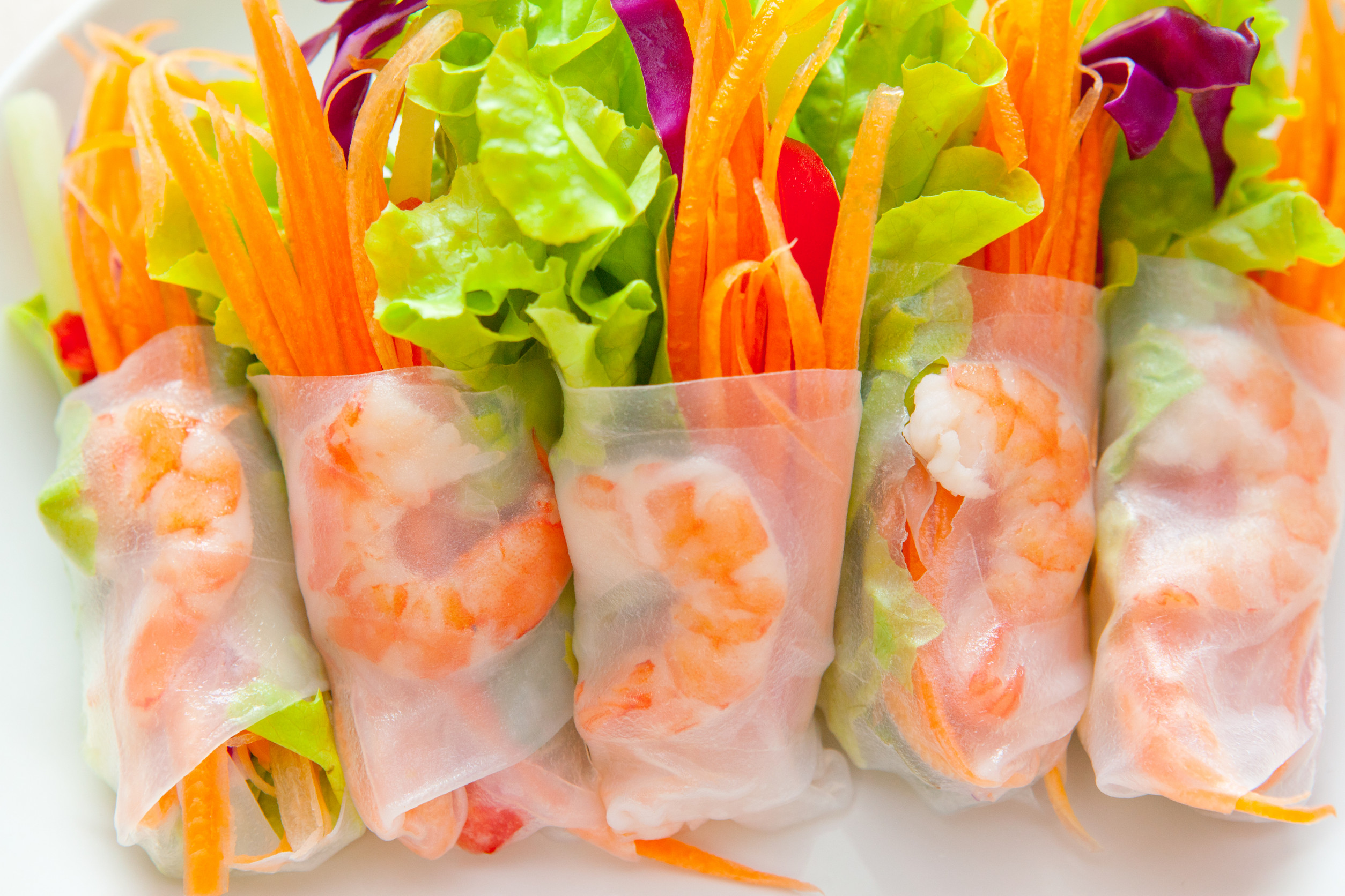 Sposób przygotowania: usmaż krewetki na patelni do uzyskania złocistego koloru. Papier ryżowy namocz w wodzie i połóż na oddzielnym talerzu. Wszystkie warzywa pokrój w słupki. Na papier ryżowy nałóż serek a następnie krewetki i warzywa po czym zwiń w rulon. Na wierzchu posyp sezamem