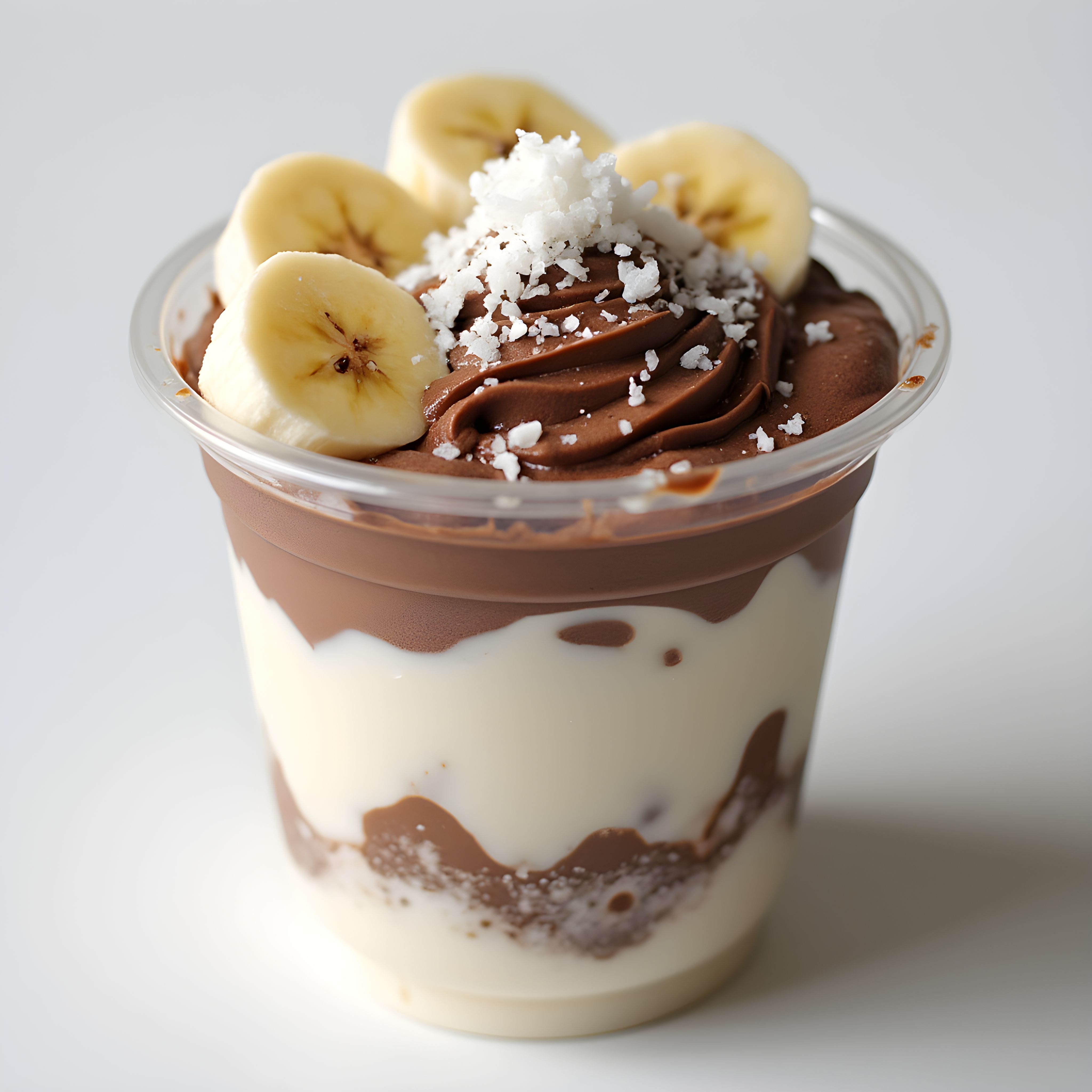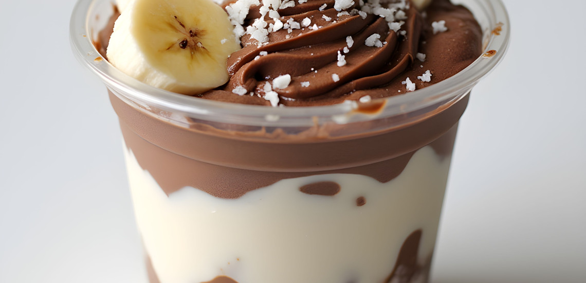 Sposób przygotowania: żelatynę zalać 50 ml wrzątku, dokładnie wymieszać i zostawić do ostygnięcia. Skyr wymieszać z mlekiem i roztworem żelatyny. Na spód pojemnika wyłożyć pokrojonego w plasterki banana i zalać przygotowaną masą, którą należy zostawić na kilka godzin w lodówce. Na wierzch wylać roztopioną w garnuszku czekoladę oraz posypać pszenicą.