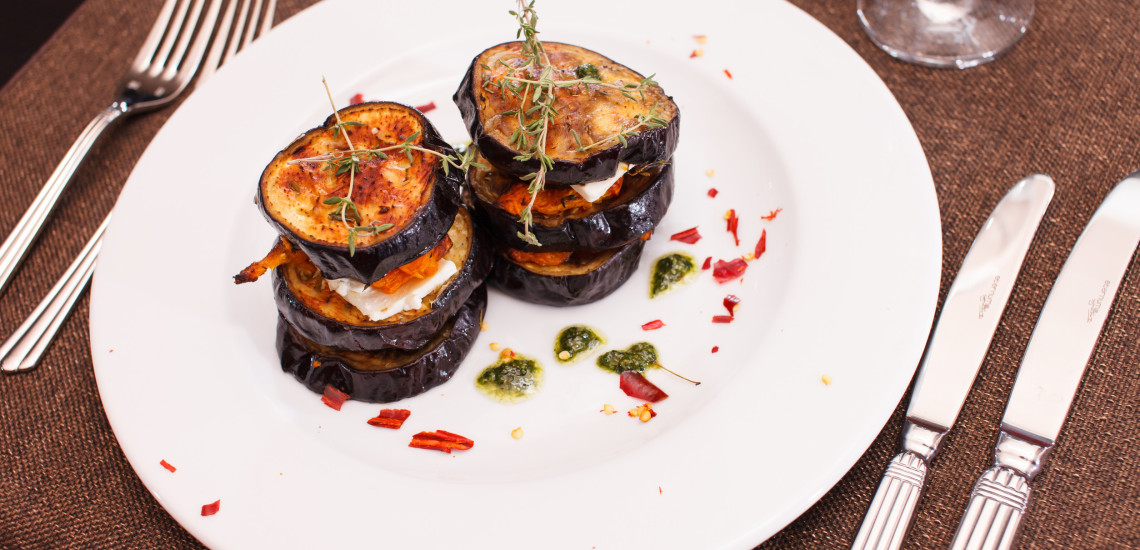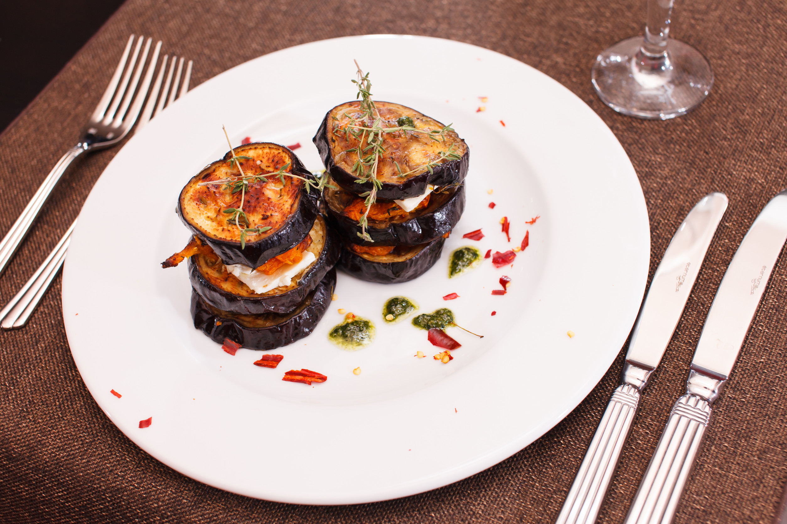 Sposób przygotowania: pokrój bakłażana w grubsze plasterki, na niego dodaj pokrojonego również w plasterki pomidora i mozzarelle. Upiecz ok 15 min w piekarniku w 180 stopniach, a następnie dodaj szynkę.